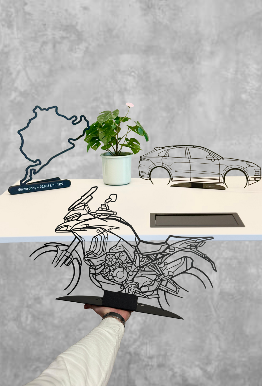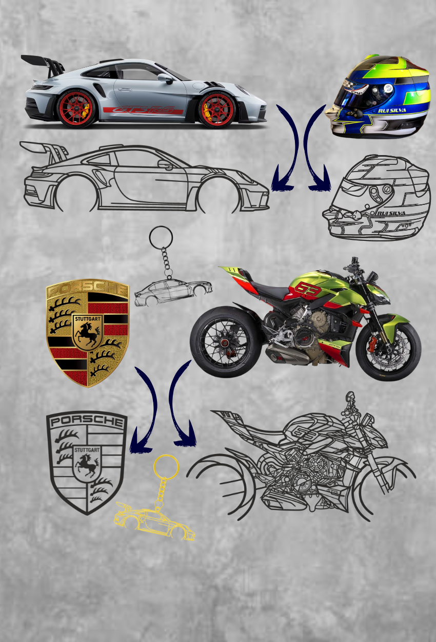 Não encontrou exatamente o que procura? Nós tratamos disso! Criamos o carro, mota, logótipo, capacete, circuito, silhueta de mesa ou porta-chaves personalizado exatamente como quiser, até mesmo o seu veículo real com todas as modificações que possa ter. Basta dizer-nos o que pretende e nós desenvolvemos o design de raiz, com todo o detalhe, aplicamos pintura eletrostática de alta qualidade e enviamos diretamente para si ou para quem quiser surpreender com um presente único. Antes de finalizar, enviamos sempre uma pré-visualização do design para que possa pedir todas as alterações que desejar até estar 100% satisfeito com o resultado final. Cada peça é feita individualmente, com dedicação e atenção ao pormenor, garantindo um resultado incrível que tem deixado todos os nossos clientes entusiastas de motores completamente rendidos.
